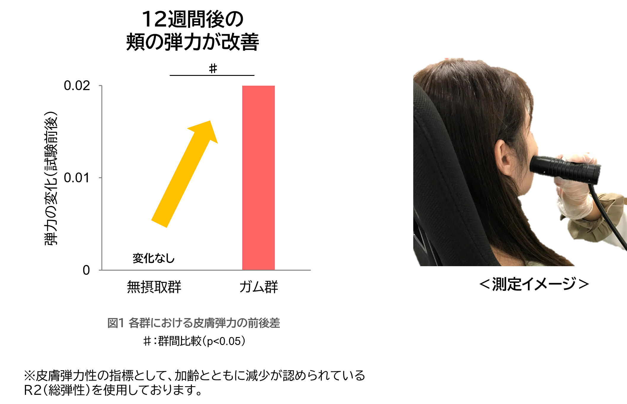 継続的なガム咀嚼トレーニングを実施することにより、肌(頬)の弾力が改善することを確認!