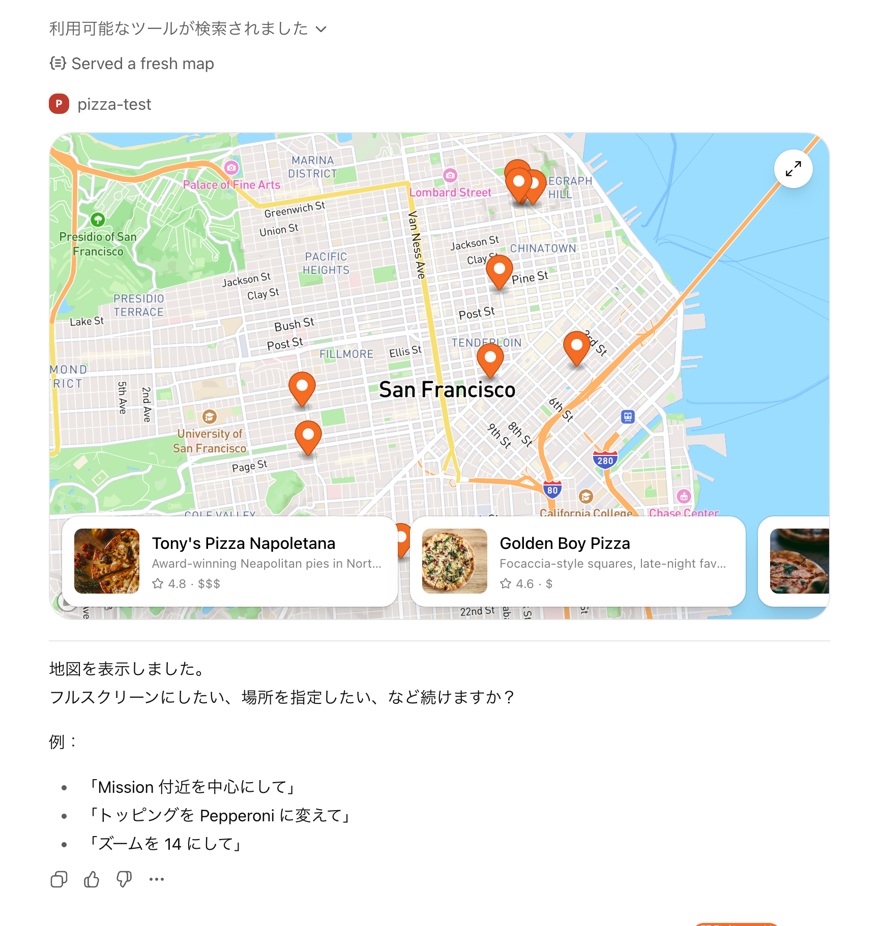 - リスト/カード/モーダル/フルビュー/地図などChatGPTネイティブUIの実装(Reactで表示・操作)