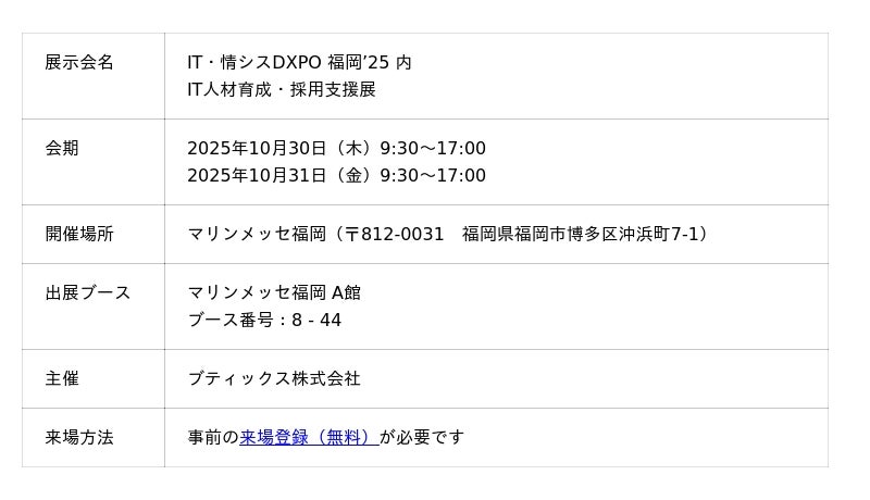 プログラミングスクール『侍エンジニア』を運営する株式会社SAMURAI(本社:東京都港区、代表取締役:羽田 吾立)は、2025年10月30日(木)・31日(金)にマリンメッセ福岡で開催される展示会『IT・情シスDXPO 福岡’25』に出展いたします。