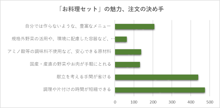 利用の決め手として「調理や片付けの時間が短縮できる」(475票)が最多となる一方、4人に1人以上が「国産・産直」「アミノ酸等の調味料不使用」「サステナブルな点」を選択しました。