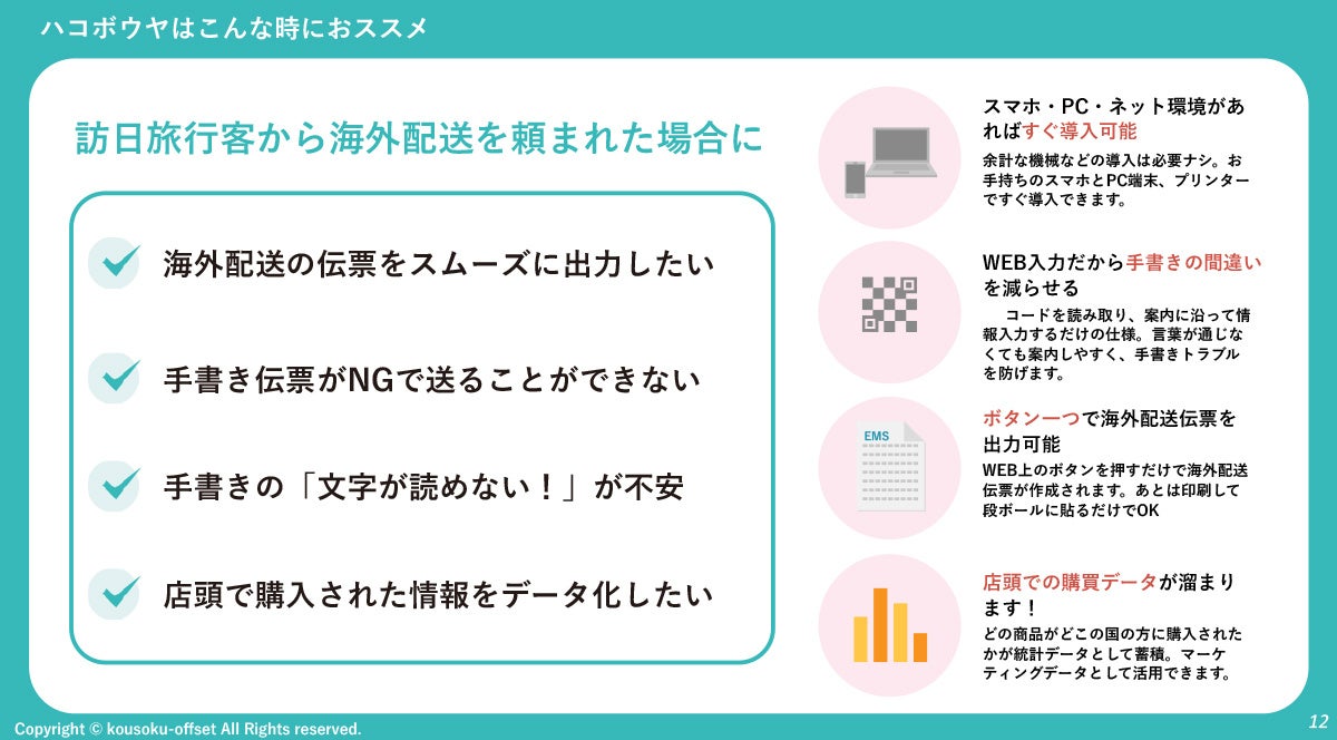 セミナーでは「印刷会社が挑む!ハコボウヤで実現した物流DX~デジタルとアナログの融合で生まれる地域活性化の可能性~」と題し、インバウンド向け物流DXサービス「ハコボウヤ」について開発に至った背景や導入効果を紹介。