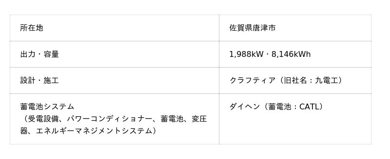 当蓄電所の設計・施工は株式会社クラフティア(旧社名:株式会社九電工、本社:福岡市中央区、代表取締役社長執行役員:石橋和幸、以下「クラフティア」)が担当し、蓄電システムには株式会社ダイヘン(本社:大阪市淀川区、代表取締役社長:蓑毛正一郎、以下「ダイヘン」)製の機器を採用しております。