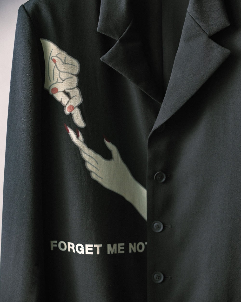 本POP-UP STOREでは、2009年春夏コレクションのランウェイに登場した象徴的なモチーフを用いて、定番素材であるウールギャバジンに抜染プリントを施して再構築したジャケット3型を展開いたします。深い黒地の中に鋏や手のモチーフが静かに浮かび上がり、時を経ても色褪せることのないデザインの魅力と存在感を備えた特別なシリーズです。