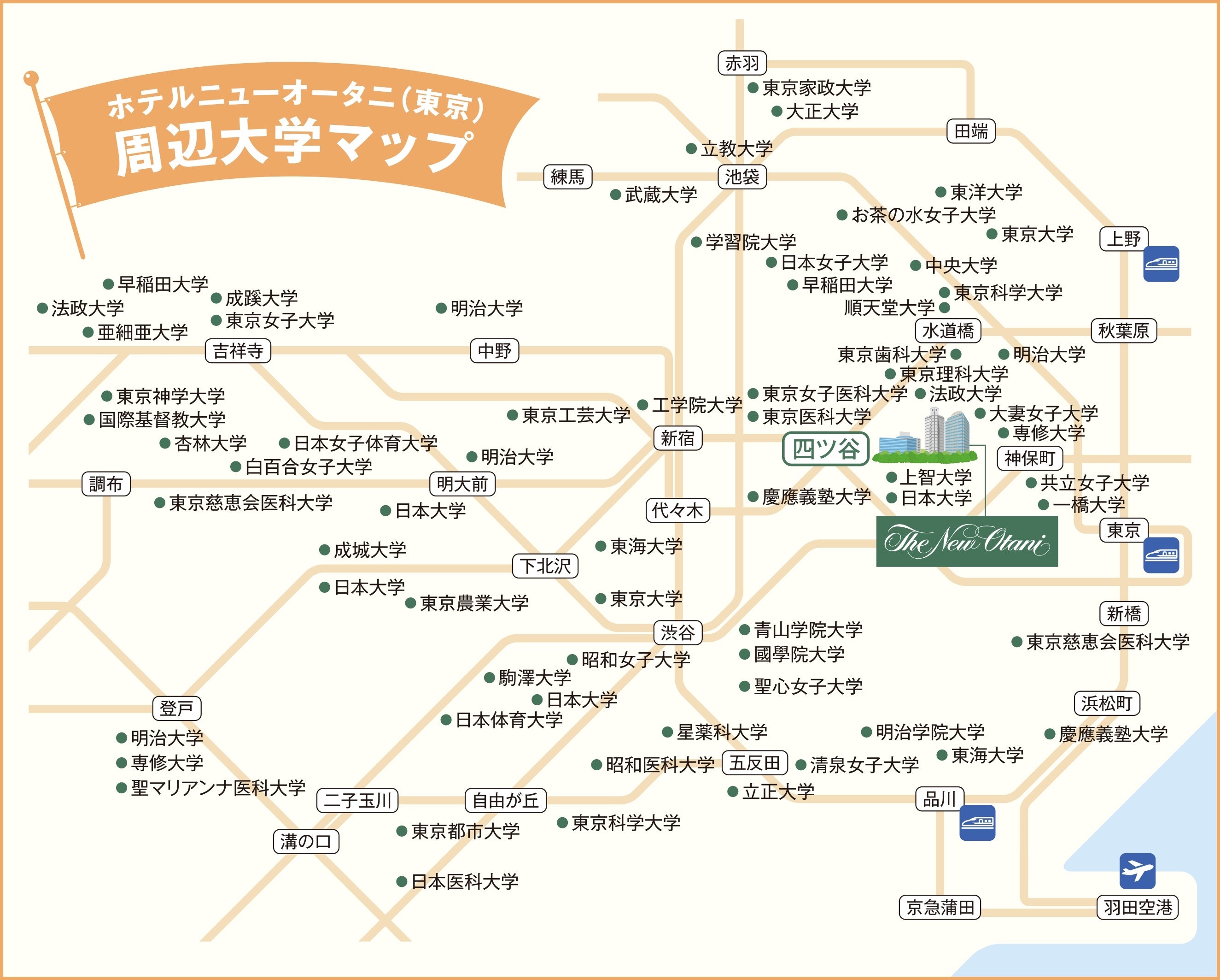 ホテルニューオータニ(東京)は、四ツ谷駅・麹町駅・赤坂見附駅・永田町駅の4駅7路線が最寄り駅。JR・東京メトロ各線が利用可能なため、都内の各大学へのアクセスが非常に良好です。特に、上京受験で慣れない土地での移動が心配な方や、会場までの移動の負担を軽減したい方には好立地の場所から出発が叶います。