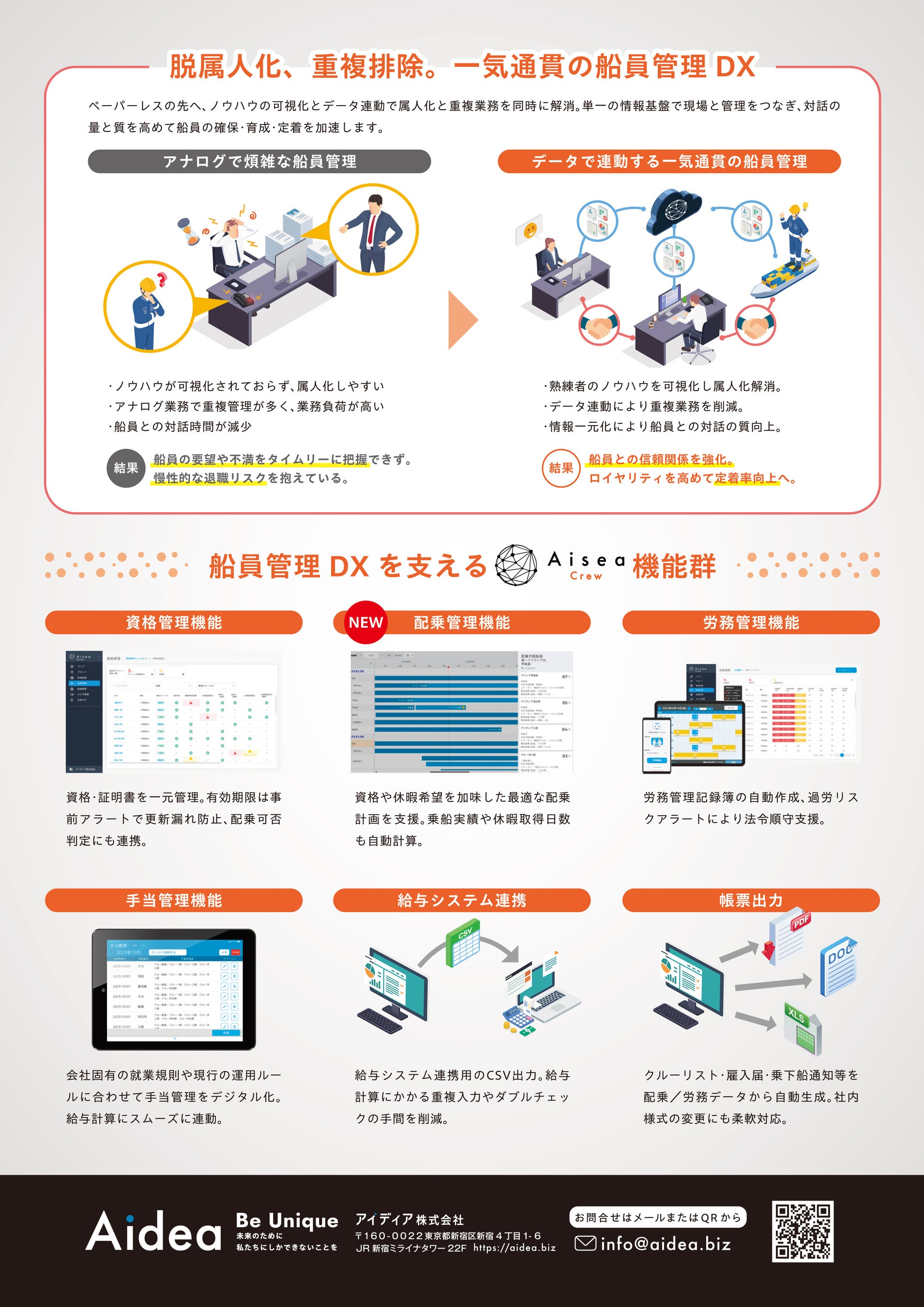 今回の「配乗管理機能」追加により、「Aisea Crew」が配乗管理~労務管理~給与計算といった船員管理のコア業務を一気通貫で電子化することが可能なサービスに進化しました。