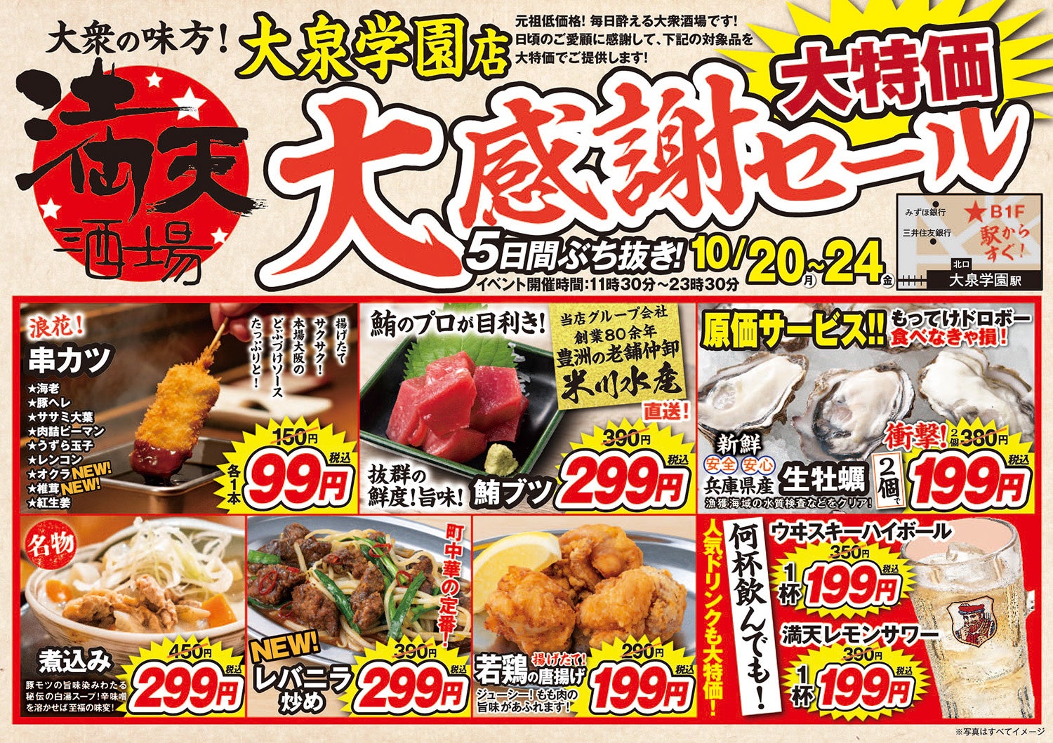 【衝撃の低価格!串カツ、生牡蠣が100円以下】大泉学園の『満天酒場』が10/20(月)から10/24(金)の5日間限定で大感謝セール!