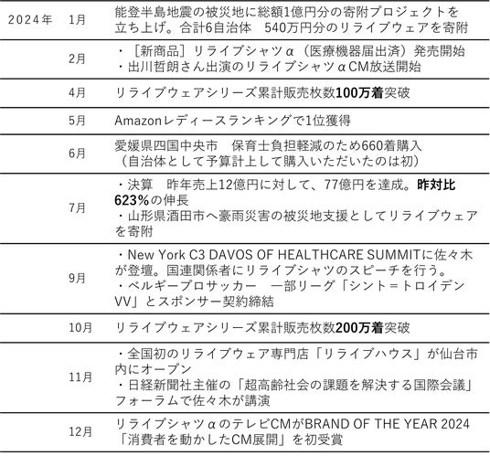 当社は2024年2月、「リライブシャツα(アルファ)」を初めて医療機器として届出を出しました。これを機に、これまでTV通販を中心に展開していた販売活動をさらに拡大し、肩や腰に悩む多くの方々の力になりたいという想いから、全国放映のテレビCMを開始いたしました。CM開始後、通販での売上も伸びたことで、2024年の業績は前年比623%の77億円と予想を大きく超える反響がありました。