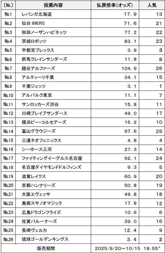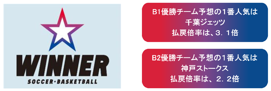 B1優勝チーム予想の1番人気は、 昨シーズンベスト4の千葉ジェッツで、払戻倍率(オッズ)は3.1倍!2番人気は、昨シーズン2位の琉球ゴールデンキングスで、払戻倍率(オッズ)は3.4倍、3番人気は、昨シーズン優勝の宇都宮ブレックスで、払戻倍率(オッズ)は3.9倍となっています。