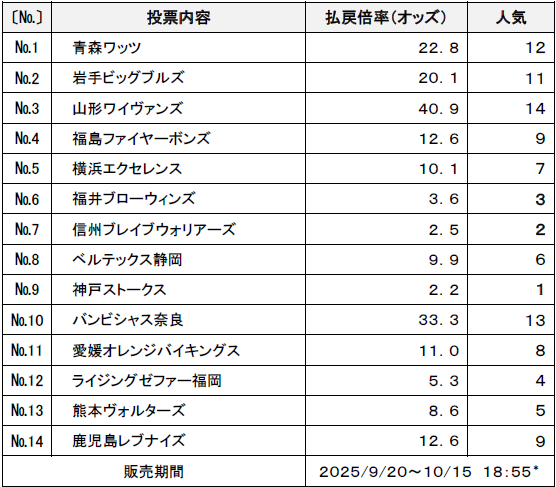 本日は、B1、B2の優勝チームを予想するくじの投票状況を紹介いたします。