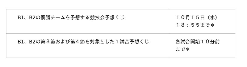 現在、B1、B2の優勝チームを予想する「競技会予想」くじと、10月15日(水)に開催される第3節、および10月18日(土)、19日(日)に開催される第4節の各試合を対象とした「1試合予想」くじを販売中です。