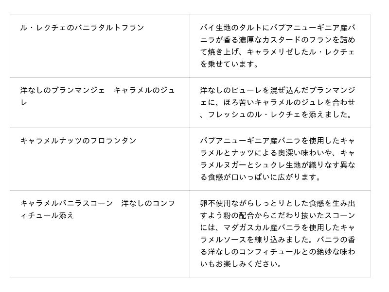 都会の中でも自然豊かな御殿山で、四季の移ろいを感じながらお楽しみいただく東京マリオットホテルのアフタヌーンティーのフェスティブシーズンの主役は、2023年の発売以来多くのお客様からご好評をいただいている”ル・レクチェ”。高い糖度ととろけるような果肉や芳醇な香りが特徴的で、幻の洋なしとも呼び声高い冬が旬のフルーツです。そこに、相性抜群の香り高いマダガスカル産・パプアニューギニア産の2種のバニラと香ばしく濃厚に甘い自家製キャラメルを合わせ、冬ならではのマリアージュをご堪能いただけるスイーツをご用意しました。スイーツでは定番のショートケーキをはじめ、マダガスカル産バニラビーンズを使用したキャラメルをムースやスコーンなど多彩なアイテムに取り入れ”ル・レクチェ”との絶妙な味わいをご堪能いただけます。セイボリーはフォアグラのマシュマロやターキーのサンドウィッチなど華やかな4品が並びます。