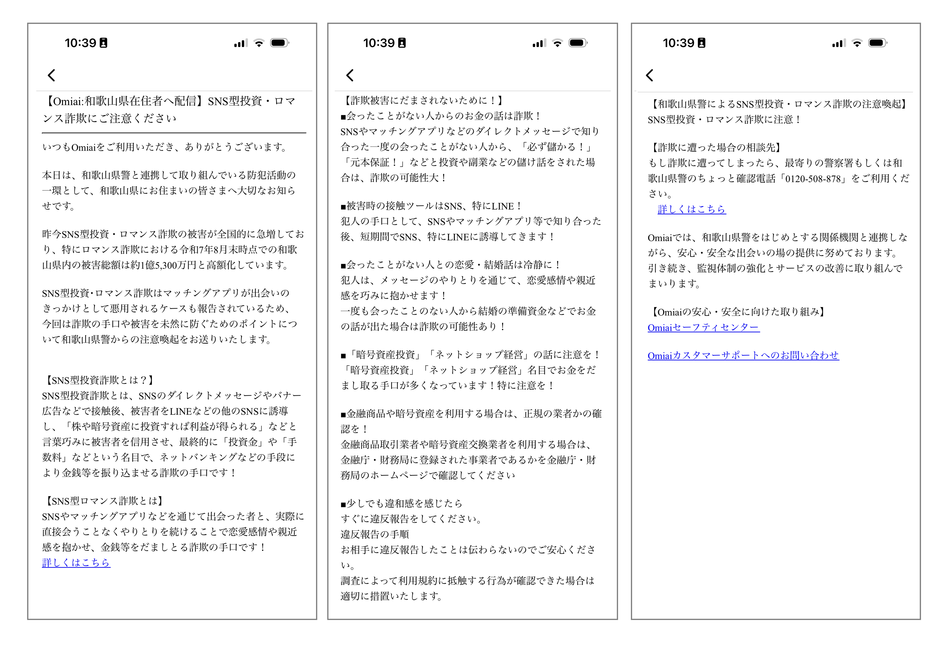 【啓発活動の一環として和歌山県警察と連携した注意喚起(「Omiai」の画面例)】