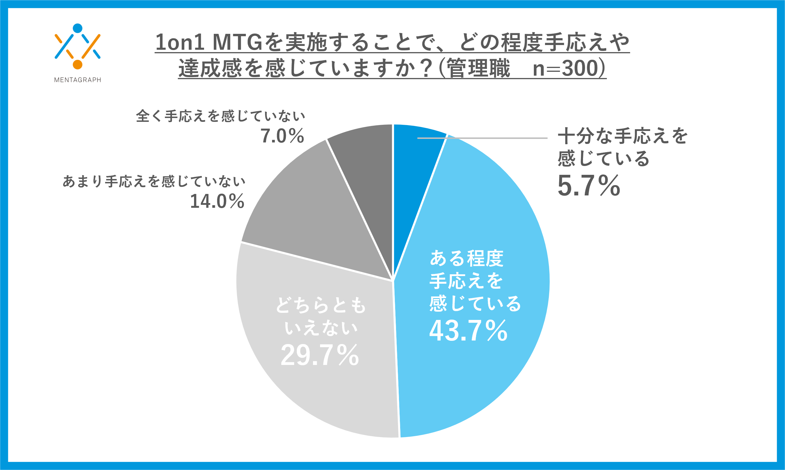 一方で、1on1に手応えを感じている管理職は約半数(十分な手応えを感じている:5.7%・ある程度手応えを感じている:43.7%)に上り、上司の手応えと部下の満足感にギャップがあることが明らかになりました。この結果は、社会的な期待や建前のもと、上司が「1on1を実施している」という行為自体に満足しやすく、本質的な部下の満足に繋がっていない可能性が示唆されます。