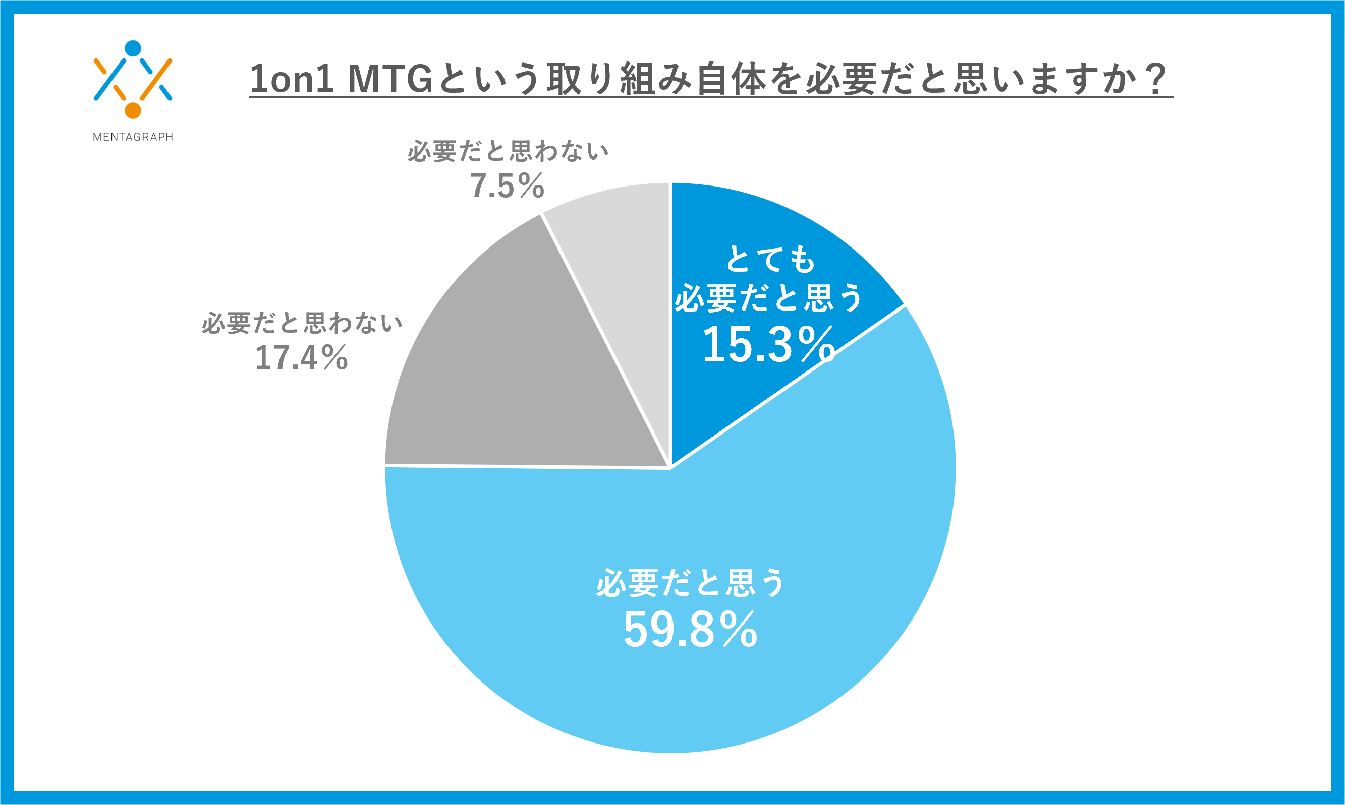 調査の結果、上司と部下間で1on1 MTGを実施している企業の割合は、41.3%になることが分かりました。1on1 MTGは必要だと思うか、という質問に対して、75.1%が必要だ(とても必要:15.3%、必要:59.8%)と回答しており、上司も部下も必要性を実感しているという結果になりました。