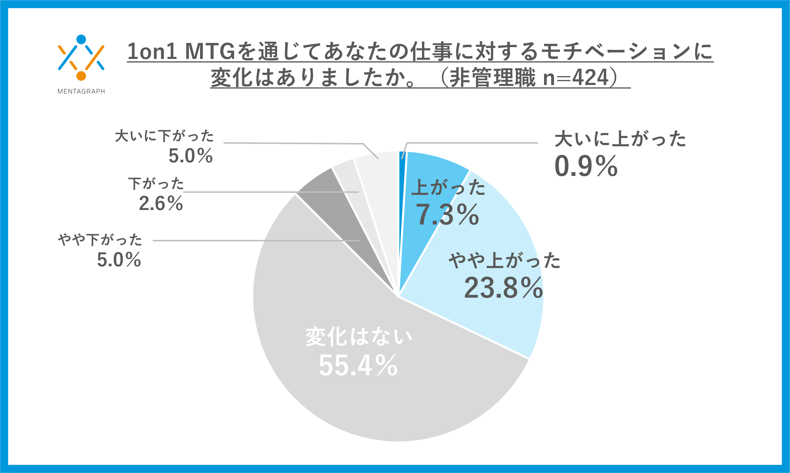 一方で、1on1 MTGの実施でモチベーションが上がったかどうか、非管理職に質問したところ、上がったと回答したのは32.0%(大いに上がった:0.9%・上がった:7.3%・やや上がった:23.8%)に留まり、約7割の非管理職は、モチベーションが上がっていないという結果になりました。