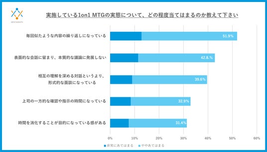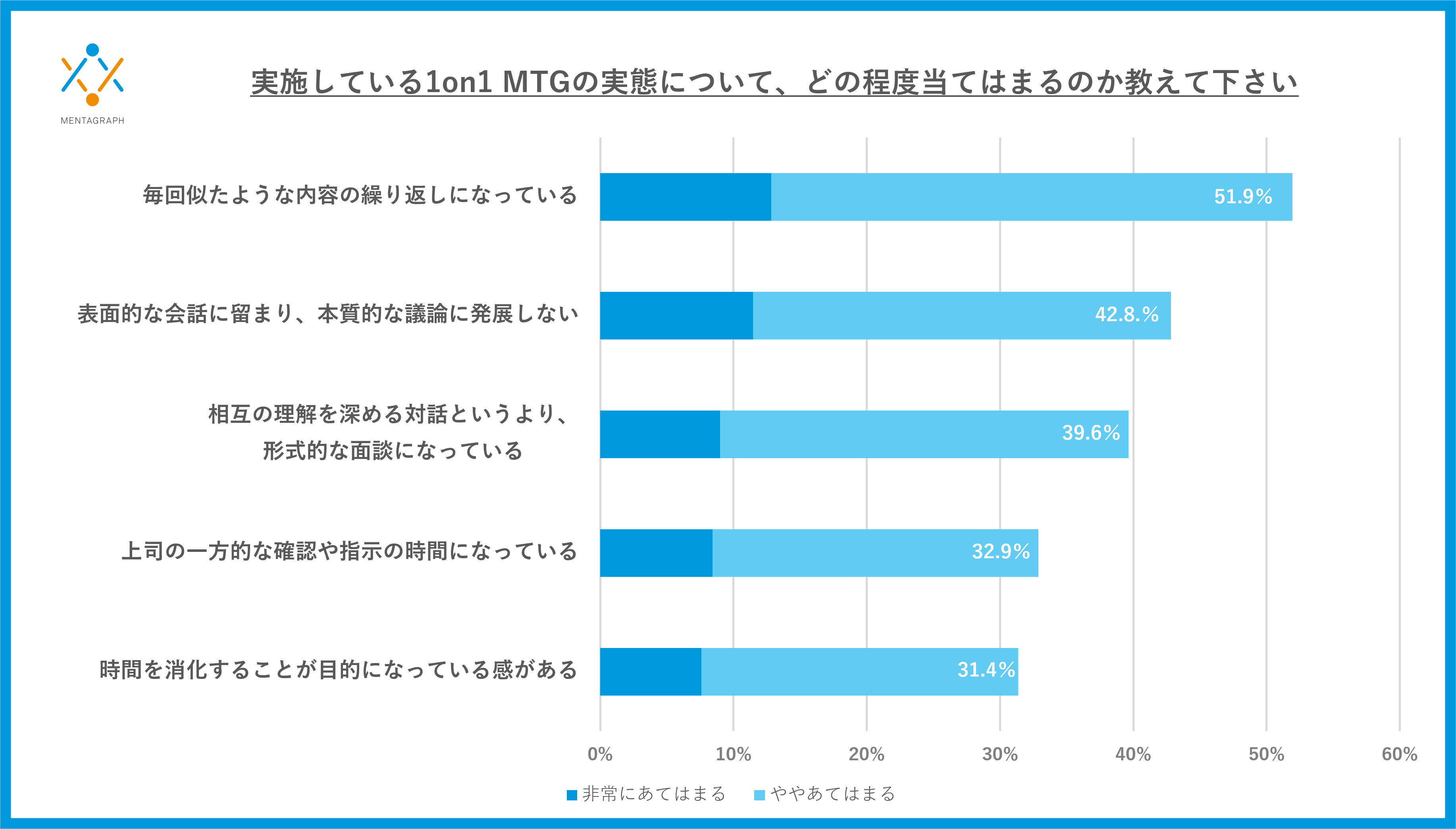 1on1 MTGの実態について調査をした設問においては、全体の51.9%が「毎回似た内容の繰り返しになっている」、42.8%が「表面的な会話に留まり、本質的な議論に発展しない」という項目に「当てはまる」と回答しており、必要と感じながらも実態としては、マンネリ化や形骸化されてしまっていることが分かりました。