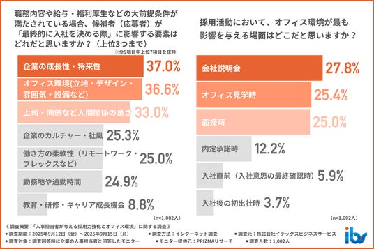 応募者が「最終的に入社を決める際」に影響すると考える要素については、「企業の成長性・将来性」がトップの決定要因で、“オフィス環境”はそれに次いで重視されており、応募者が応募後・選考中に体験する空間や雰囲気が、入社の可否を左右するポイントと考えられていることが示されました。