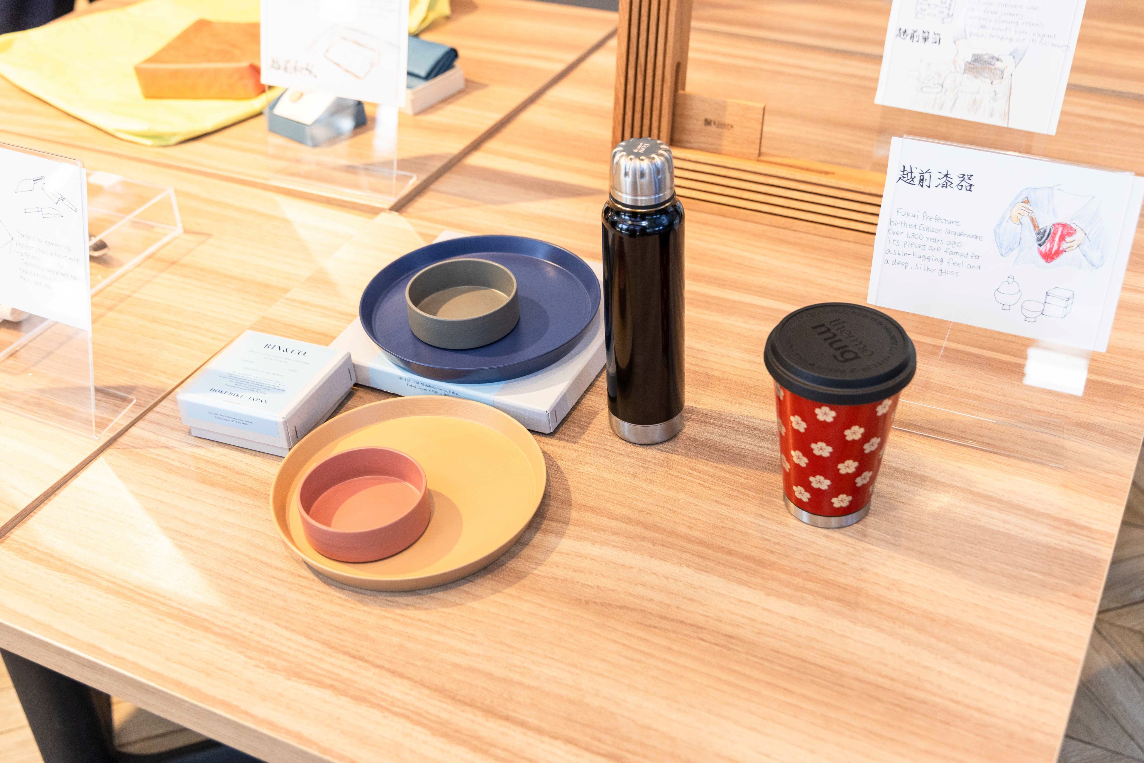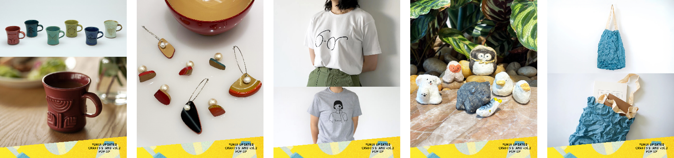 越前焼 ・YOSHIDA YUKI【HARIMON MUG】、漆器 ・漆琳堂【kacera】ピアス、SAVA!STORE【福井柄Tシャツ】、越前和紙【わしまる】置物、kna plus 【KUSHA】バッグ