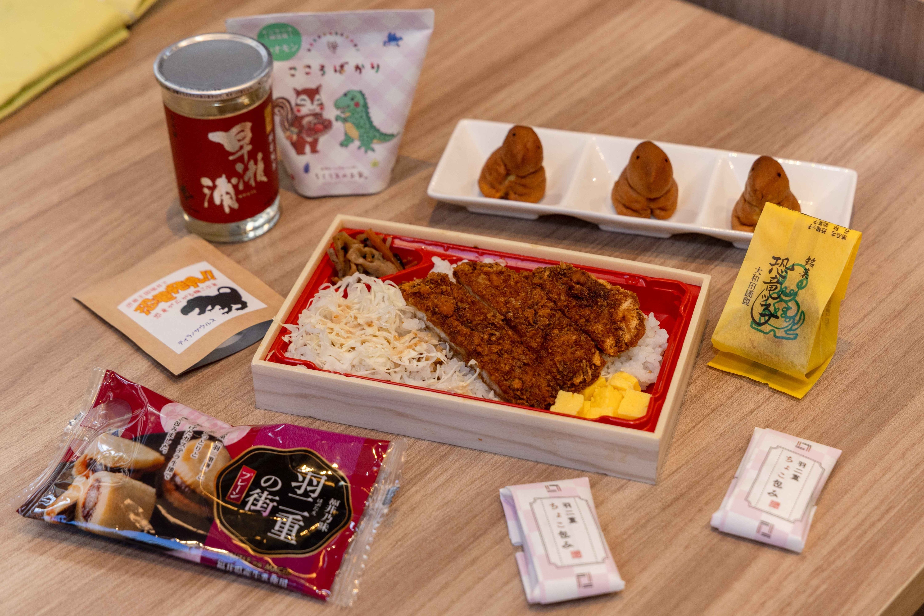 (左上から)日本酒【早瀬浦 別撰 特別純米】、菓子・ちさリスのお家【ケンケーラ】、菓子・大和田【恐竜ッ子】、茶・丸松茶舗【恐竜梅こんぶ茶】、JAPAN RAIL CAFE Singapore【ソースカツ弁当】、菓子・新珠【羽二重の街】、菓子・村中甘泉堂【羽二重ちょこ包み】