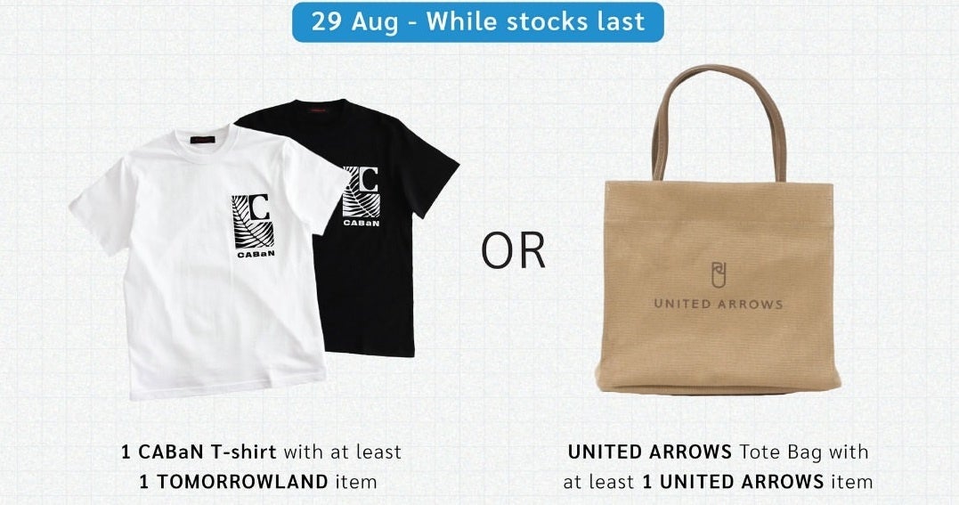 CABaNのTシャツは、1周年のアニバーサリーを祝う限定デザイン。UNITED ARROWSのトートバッグは、ちょっとしたお出かけにぴったりな、シンプルで洗練されたアイテムです。どちらも幅広いスタイルに合わせやすく、高級感あふれるクオリティでご用意しており、お客さまからもたくさんの喜びのお声をいただいております。