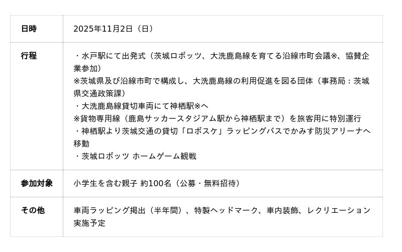 株式会社茨城ロボッツ・スポーツエンターテインメント(本社:茨城県水戸市、代表取締役社長:川崎篤之、以下「茨城ロボッツ」)は、鹿島臨海鉄道株式会社、沿線自治体ならびに地元企業と連携し、大洗鹿島線の利用促進およびプロスポーツ観戦を通じた地域活性化を目的とした茨城ロボッツ観戦ツアーを実施いたします。