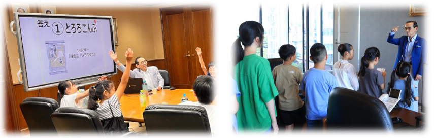 イズでは社長の名前や好きな食べ物など親しみやすい内容も盛り込まれ、子どもたちは笑顔で参加して