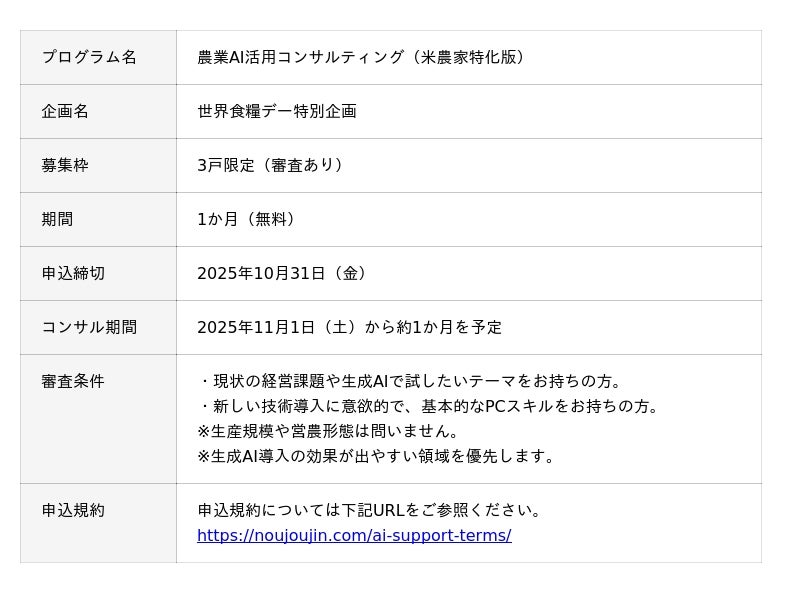 農業コンサルティングを展開する「株式会社農情人(本社:千葉県船橋市、代表取締役:甲斐雄一郎)」は、10月16日の「世界食糧デー」に合わせ、日本の米農業の持続可能性を高めるための「農業AI活用コンサルティング」を、米農家を対象に無料提供します。本プログラムは、生成AIによる業務効率化と所得向上を支援し、低所得・高齢化・後継者不足が進む米農業を「稼げる持続可能な農業」へと転換させる挑戦です。