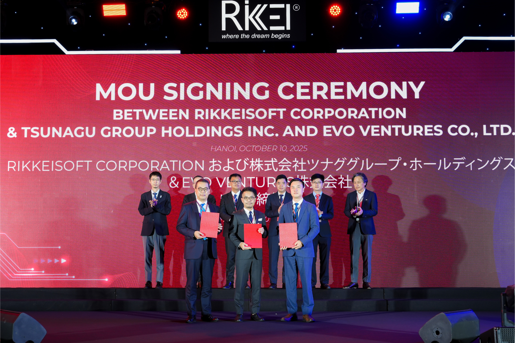 事業を加速的に推進していくことを表明するため、2025年10月10日、ベトナム ハノイで開催されたRikkeisoftが主催する国際テクノロジーイベント「RIKKEI GLOBAL SUMMIT 2025」にて調印式を執り行いました。