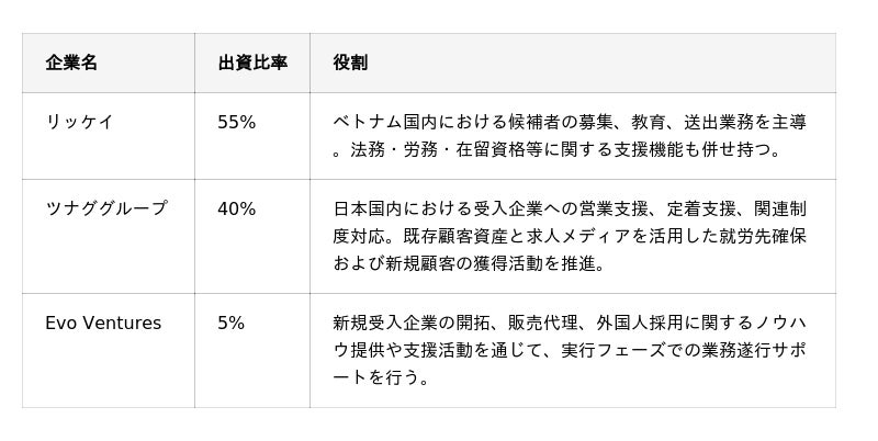 リッケイ、Evo Ventures、ツナググループ3社で合同出資。ベトナムを中心としたアジア地域から優秀な人材の採用・育成・送り出し・受け入れ・定着支援をフルパッケージで展開する体制の構築を目指し、「株式会社RKTsunagu」を設立しました。資本金:2,000万円