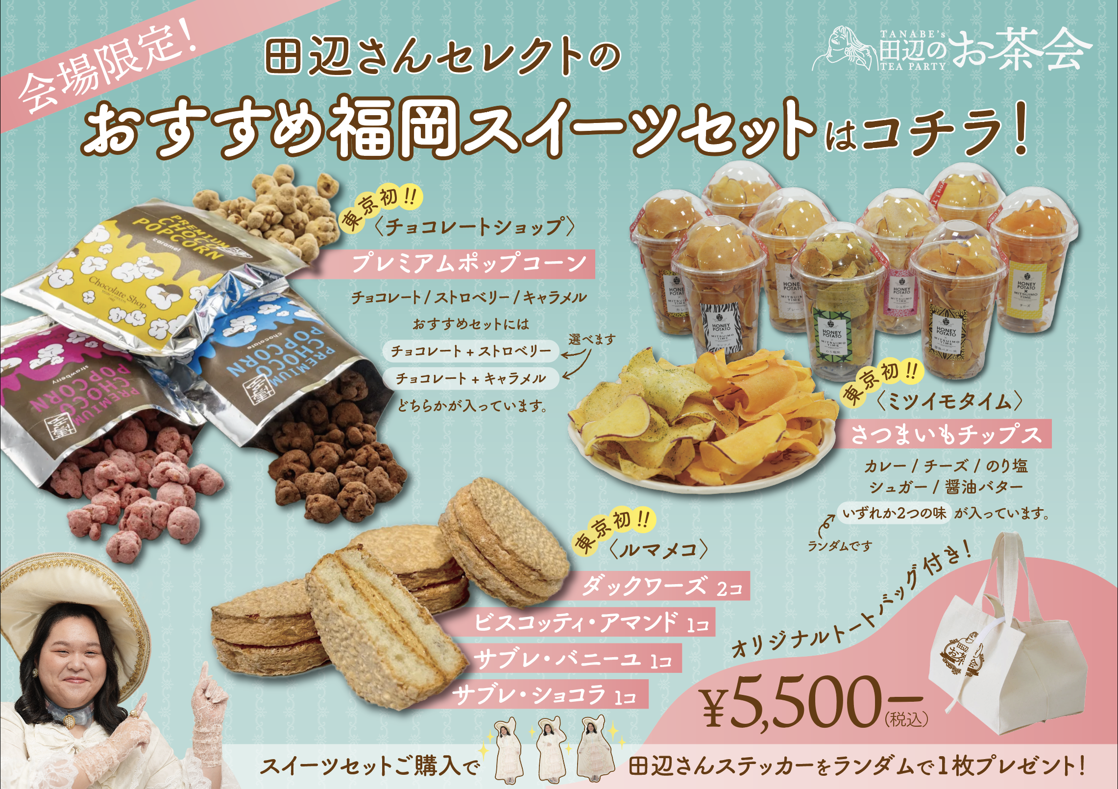 冠番組KBC『ぼる部屋』を始め、福岡での仕事も多い田辺がセレクトした「おすすめ福岡スイーツセット(トートバッグ付き)」や、会場でしか買えないオリジナルグッズも多数販売いたします。