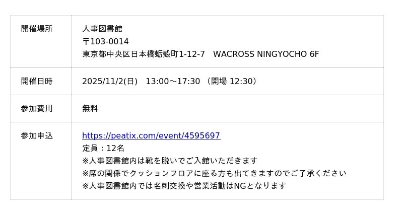 2024年4月1日に東京人形町にオープンした、人事関連職が集まるコワーキング×コミュニティ。2500冊以上の人事に関する書籍と700名以上の会員を有しており「仲間と学びで、未来を拓く」をタグラインに運営しています。