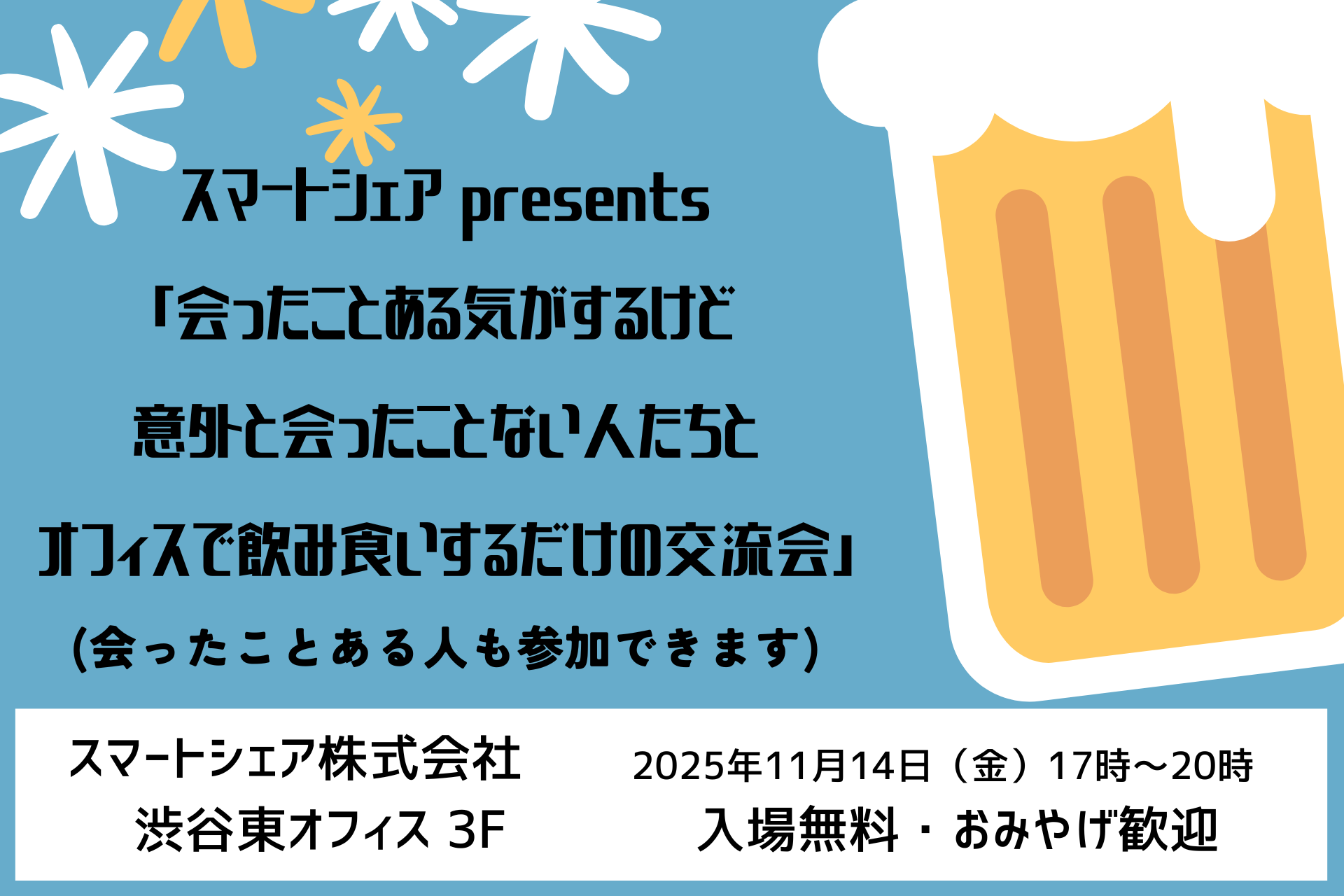 スマートシェア株式会社(本社:東京都渋谷区、代表取締役社長:小野澤 良友)は、2025年11月14日(金)17時より、渋谷東オフィスにて「会ったことある気がするけど 意外と会ったことない人たちと オフィスで飲み食いするだけの交流会」を開催いたします。