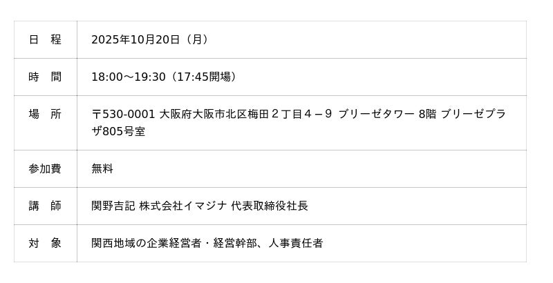 株式会社イマジナ(本社:東京都千代田区、代表取締役社長:関野吉記)は、2025年10月20日(月)に大阪市北区梅田のブリーゼプラザにて、関西地域の経営者を対象としたセミナー「関西企業の組織変革を加速させる!『社員共感型ブランディング』の実装戦略」を開催いたします。