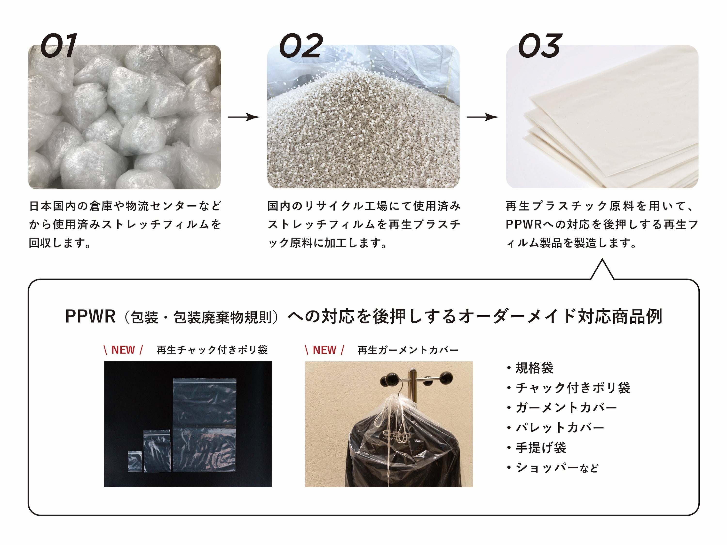 本サービスでは、用途や仕様、必要数量などのご要望に合わせて、国内外の提携フィルム製品メーカーにて使用済みストレッチフィルム由来の再生プラスチック原料を用いて、「規格袋」「チャック付きポリ袋」「ガーメントカバー」「パレットカバー」「手提げ袋」「ショッパー」などの包装資材のオーダーメイドに対応します。