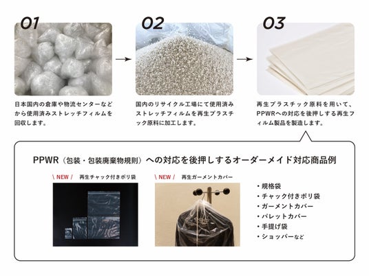 プラスチックリサイクルのトータルプロデュース事業を展開する株式会社パンテック(本社:滋賀県大津市、代表取締役社長:黒木 慶一、以下、「パンテック」)は、使用済みストレッチフィルム由来の再生プラスチック原料を用いたポリエチレン製の包装資材(チャック付きポリ袋、パレットカバーなど)をオーダーメイドする新サービス(以下、「本サービス」)の提供を開始しました。