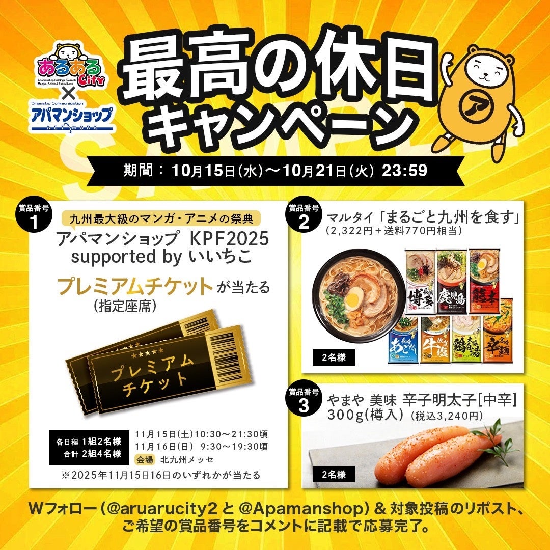 賃貸住宅仲介業店舗数No.1*のAPAMAN株式会社(東京都千代田区・EL CAMINO REAL株式会社の連結子会社 代表取締役社長 山崎戒)は、北九州・小倉のポップカルチャー拠点「あるあるCity」とアパマンショップは、X(旧Twitter)にてタイアップキャンペーンを2025年10月15日(水)10:00~10月21日(火)23:59で実施します。Wフォロー&対象投稿のリポスト、指定ハッシュタグを付けた引用ポストで応募完了。アパマンショップ KPF2025 supported by いいちこのプレミアムチケット(11月15日、11月16日のいずれか1日/合計2組4名)や、九州の人気フードギフトが当たります。