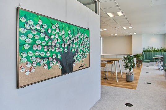 フロア入り口のビジュアル壁には、出社時に温かいつながりを感じられる社員紹介ボードを掲示