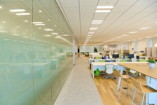 自然光が差し込む広々としたワークスペース。フリーアドレス制を採用し、偶発的な会話やアイデアが生まれるつながりの空間
