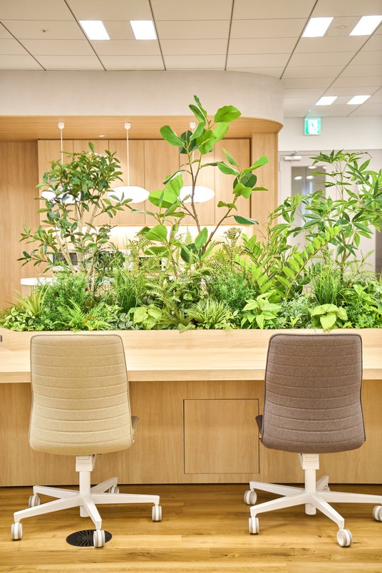 自然光と緑が調和する爽やかな空間のオフィスエントランス