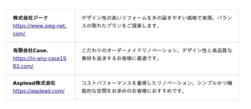 お客様一人ひとりのご要望にお応えするため、実績豊富な内装業者3社と提携しました。お客様のご予算や好みに合わせて、最適なパートナーをご紹介し、リノベーションの設計から施工までを一貫してサポートします。