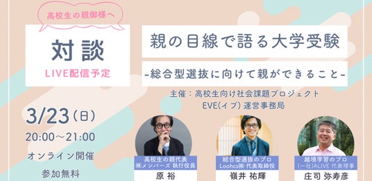 Loohcs株式会社(本社:東京都、代表取締役:嶺井祐輝)および一般社団法人ALIVE(代表理事:庄司弥寿彦)は、2025年3月23日(日)20:00より、大学受験における総合型選抜の最新動向を学び、保護者としての役割を考える無料オンラインイベント「親の目線で語る大学受験~総合型選抜に向けて親ができること~」を開催いたします。