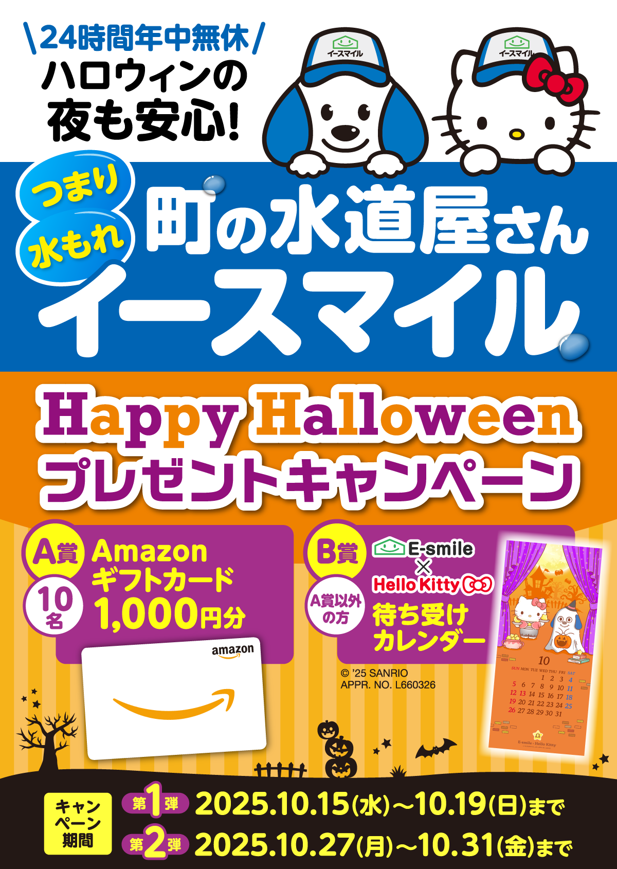 公式X フォロー&リポストで応募完了!町の水道屋さんイースマイルでは、抽選で20名様にAmazonギフトカード1000円分が当たる『ハッピーハロウィンキャンペーン』を実施いたします!