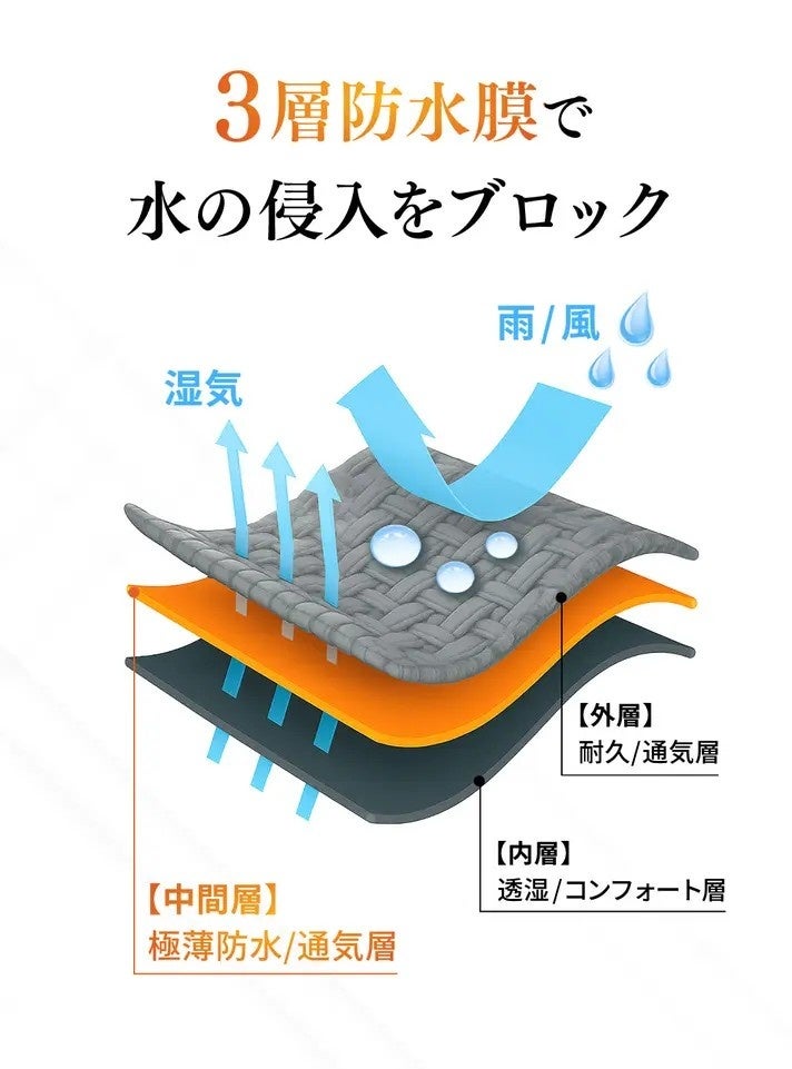 防水性だけでなく、保温性と快適性にもこだわった仕様です。