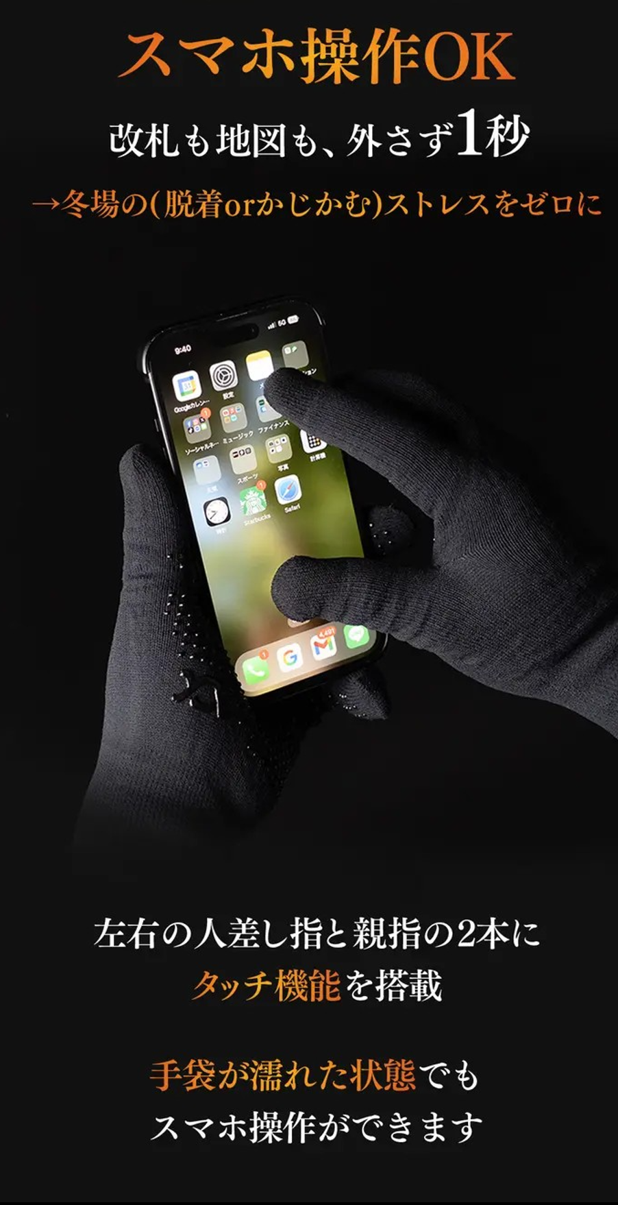 指先には高感度の導電性素材を採用し指先が濡れた状態でもスムーズにタッチパネル操作が可能です。親指と人差し指でスマートフォンやタブレットの操作ができるため、電車の中や移動中でも手袋を外すことなく、地図アプリの確認や音楽の操作が行えます。