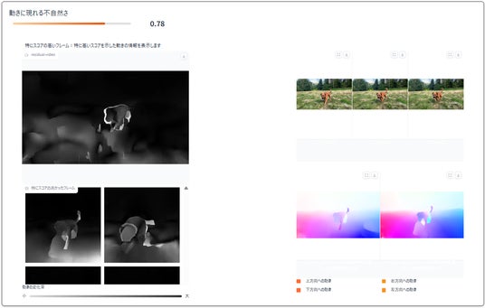 動画の各フレーム間の差分を利用し、動きの微細な不自然さを検出する機能です。従来の検出モデルに加えて、動きの不自然さという新たな検出視点を持つ本モデルを追加し、検出モデルの多重化を強化したことで、従来よりも巧妙なフェイク動画に対する検出力の強化を実現しています。