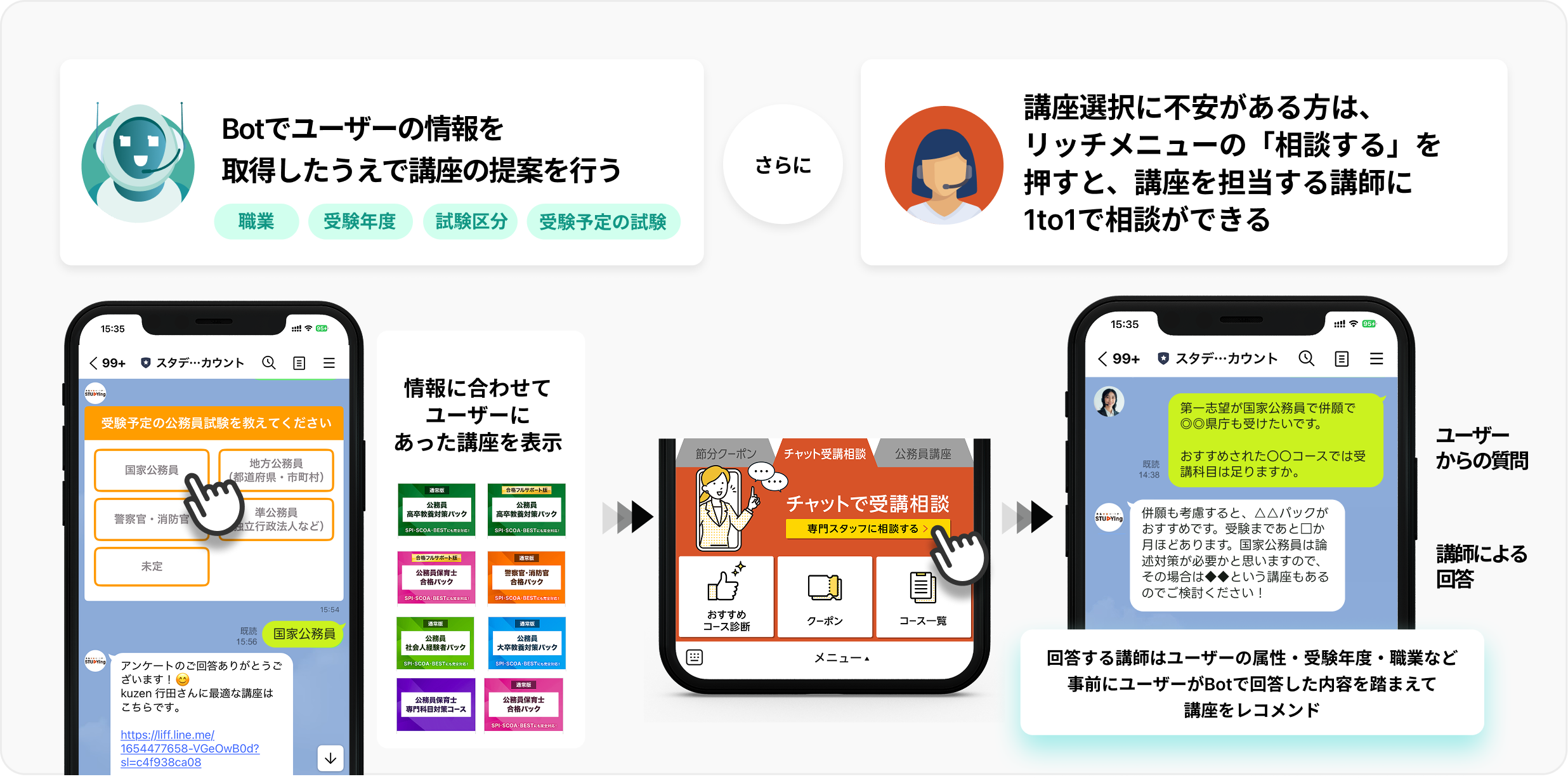 さらに、効率的なBotと有人チャットを組み合わせたハイブリッドなコミュニケーションを設計。Botが希望講座や受験年度といった基本情報をヒアリングして最適な講座を自動提案し、より深い相談を希望される方には、専門知識を持つ講座担当の講師との1to1チャットへシームレスに繋ぎます。この仕組みにより、購入前の不安解消から学習中の相談まで、一人ひとりのキャリアプランに寄り添う伴走型サポートを実現。ユーザーが納得・安心して受講できる信頼関係を築き、講座購入後も学習継続を強力に後押ししています。