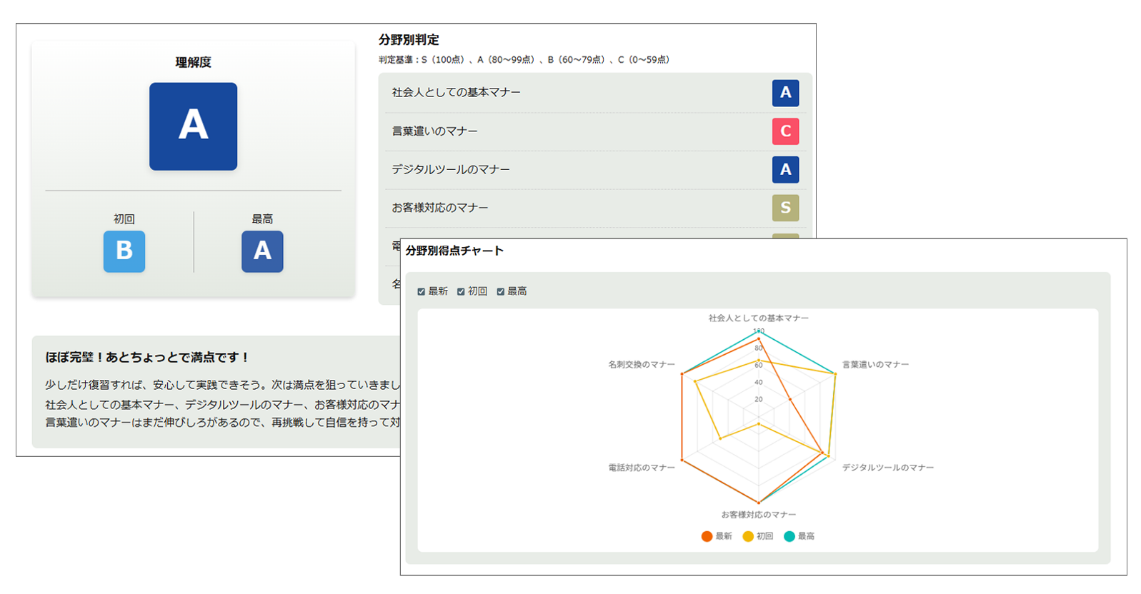 分野ごとの「採点結果」およびすべての分野の「総合評価」で自身の弱みを客観的に把握できるので、効率的に弱点を補うことができます。