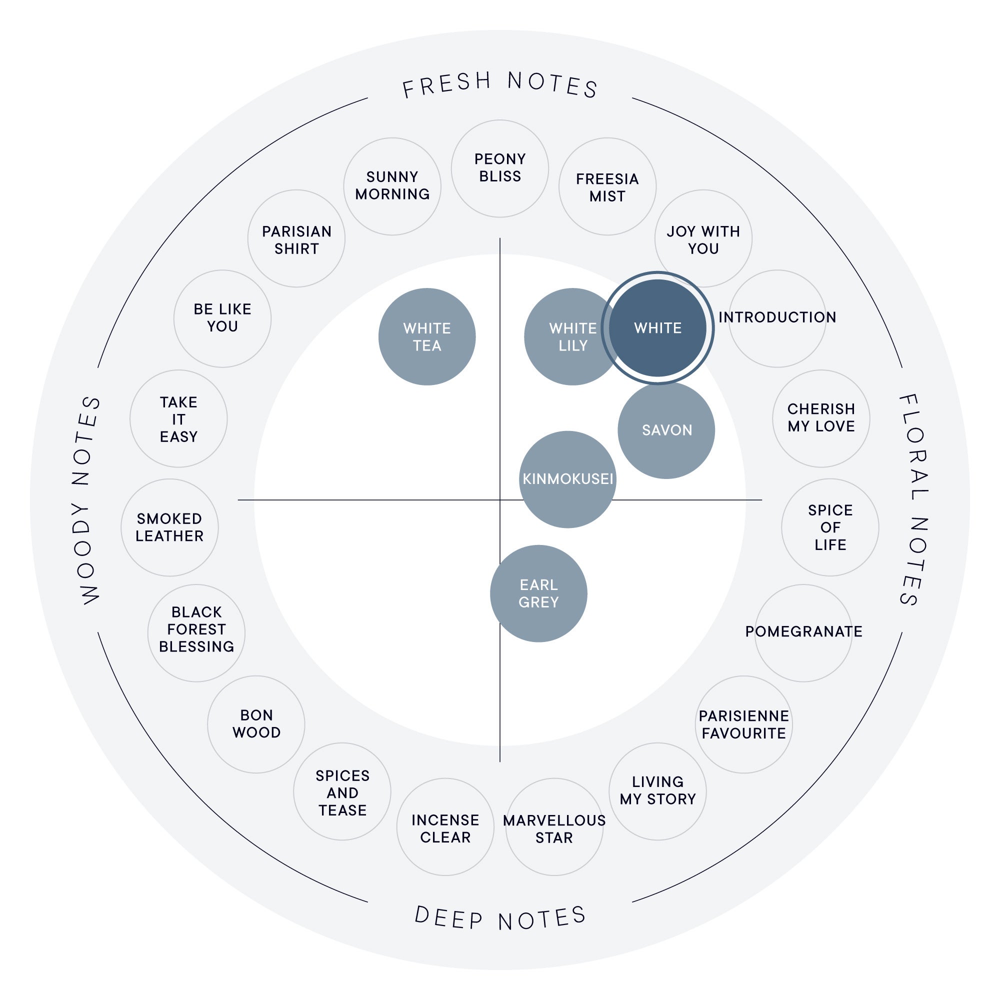 甘さと爽やかさが調和した、透明感あふれるフローラルが特徴の「ホワイト」は、2021年に限定フレグランスとして初登場して以来、多くのファンの皆様が愛して止まない香りとして人気を誇っています。みずみずしいアップルやベルガモットと、ホワイトティーが爽やかに香るトップノートにはじまり、ジャスミンやスズラン、ホワイトリリーが可憐に咲き誇るミドルノートへ。ラストノートではムスクやサンダルウッドが穏やかに香り立ち、やさしく温もりに満ちた余韻に包まれます。