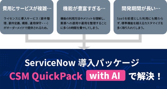 エクシオ・デジタルソリューションズ株式会社(本社:東京都港区、代表取締役社長:前田幸一)は、弊社独自のServiceNow導入サービス「CSM QuickPack」にAIを搭載した新しいソリューション「CSM QuickPack with AI」を本日リリースいたしました。