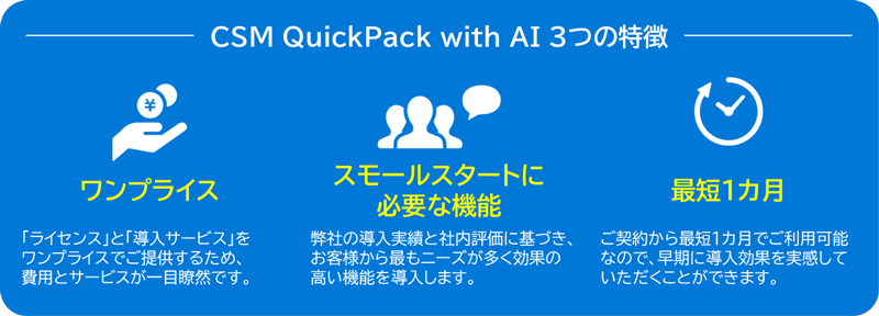 「CSM QuickPack with AI」は、問い合わせ業務の“スモールスタートに必要な機能を厳選”するとともに、弊社の多数の導入実績に基づいた“テンプレート化された導入プロセス”の実行によって、明瞭な価格設定で短期間でのご提供が可能となっています。